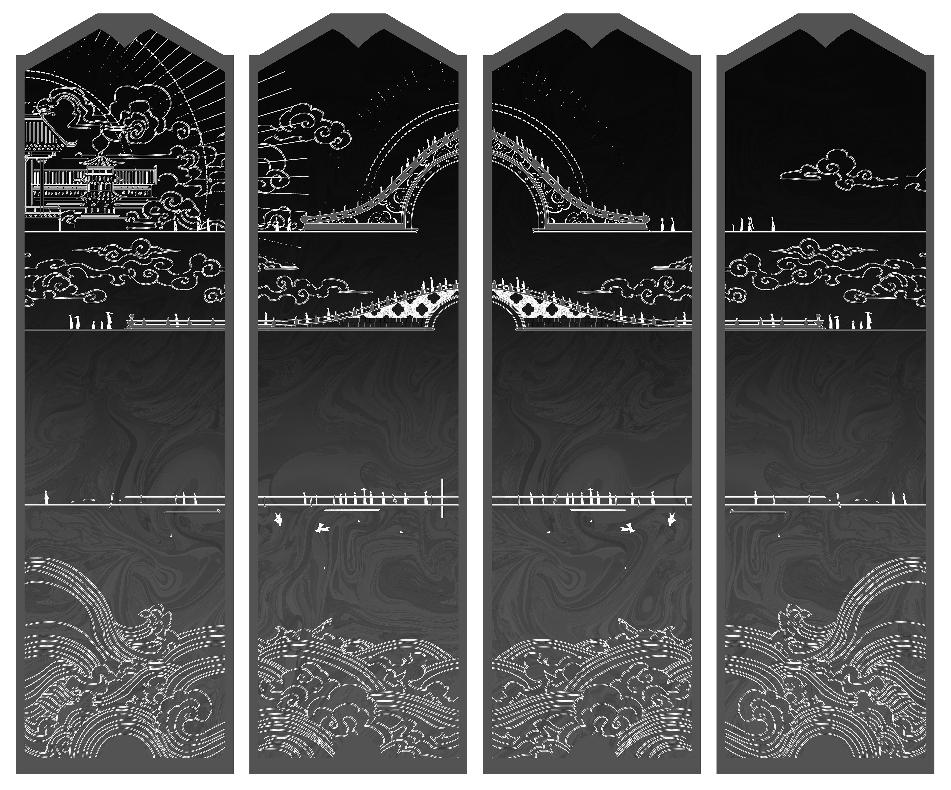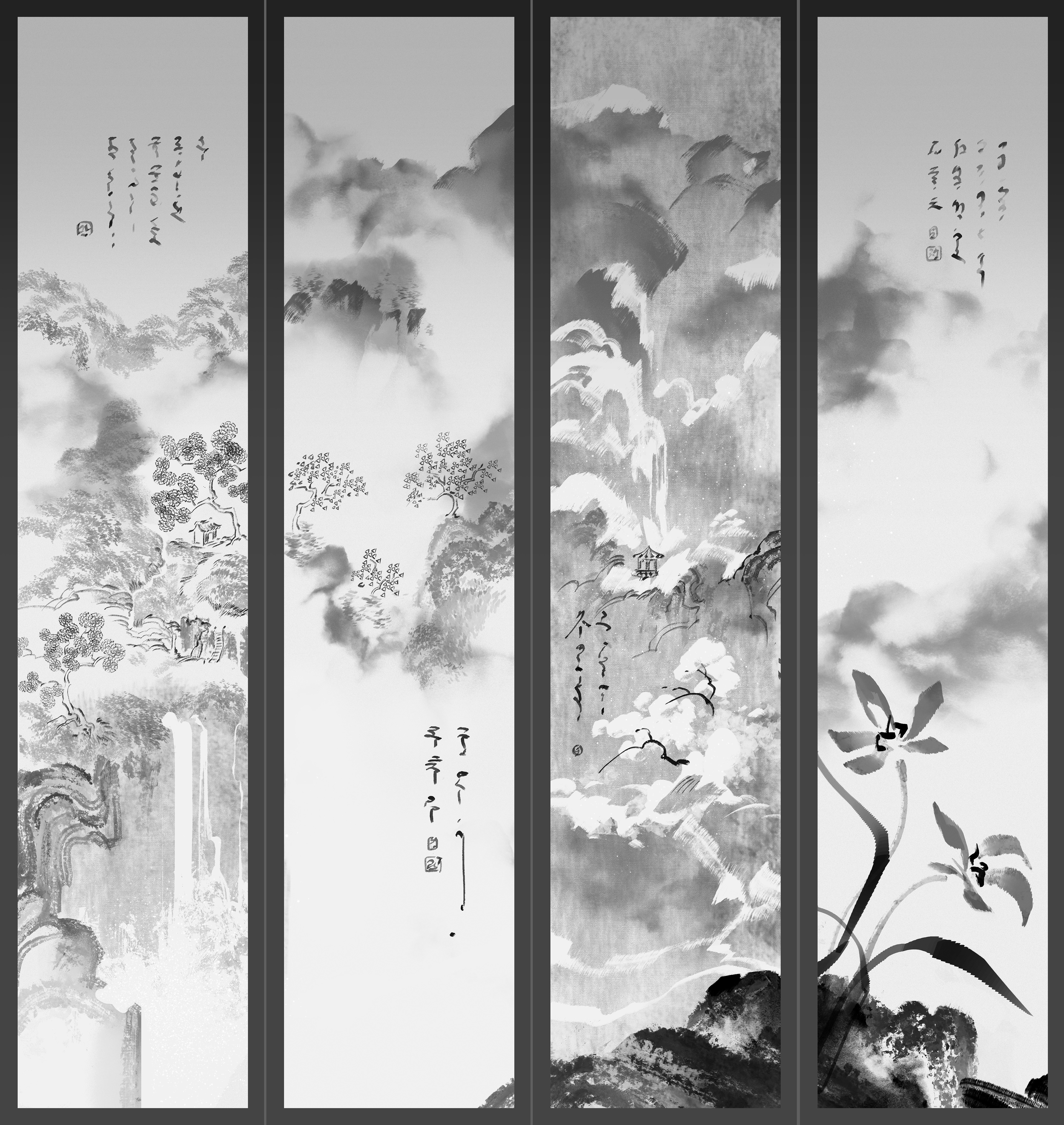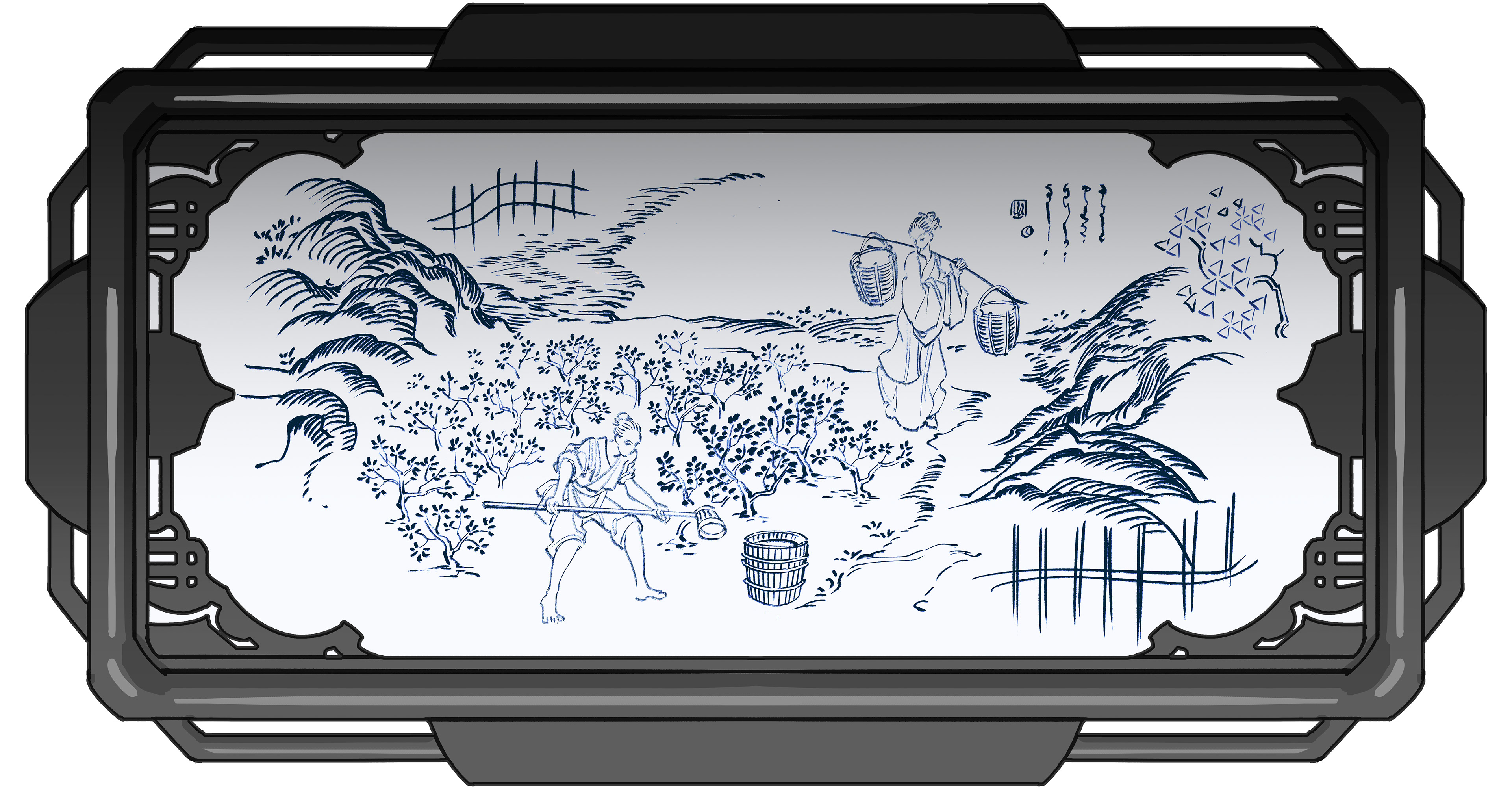 Graphics for Wen Yi's room. Wen Yi has an interest in history, so I thought she might collect illustrated panels depicting tea production, tea magic, and tea exports (to Soland in the west). Because Ci has been colonized for a while, I referenced Chinese illustrations created for western audiences. Other graphics reference her journey (death/rebirth) and powers of prophecy—these are more rooted in Chinese culture.