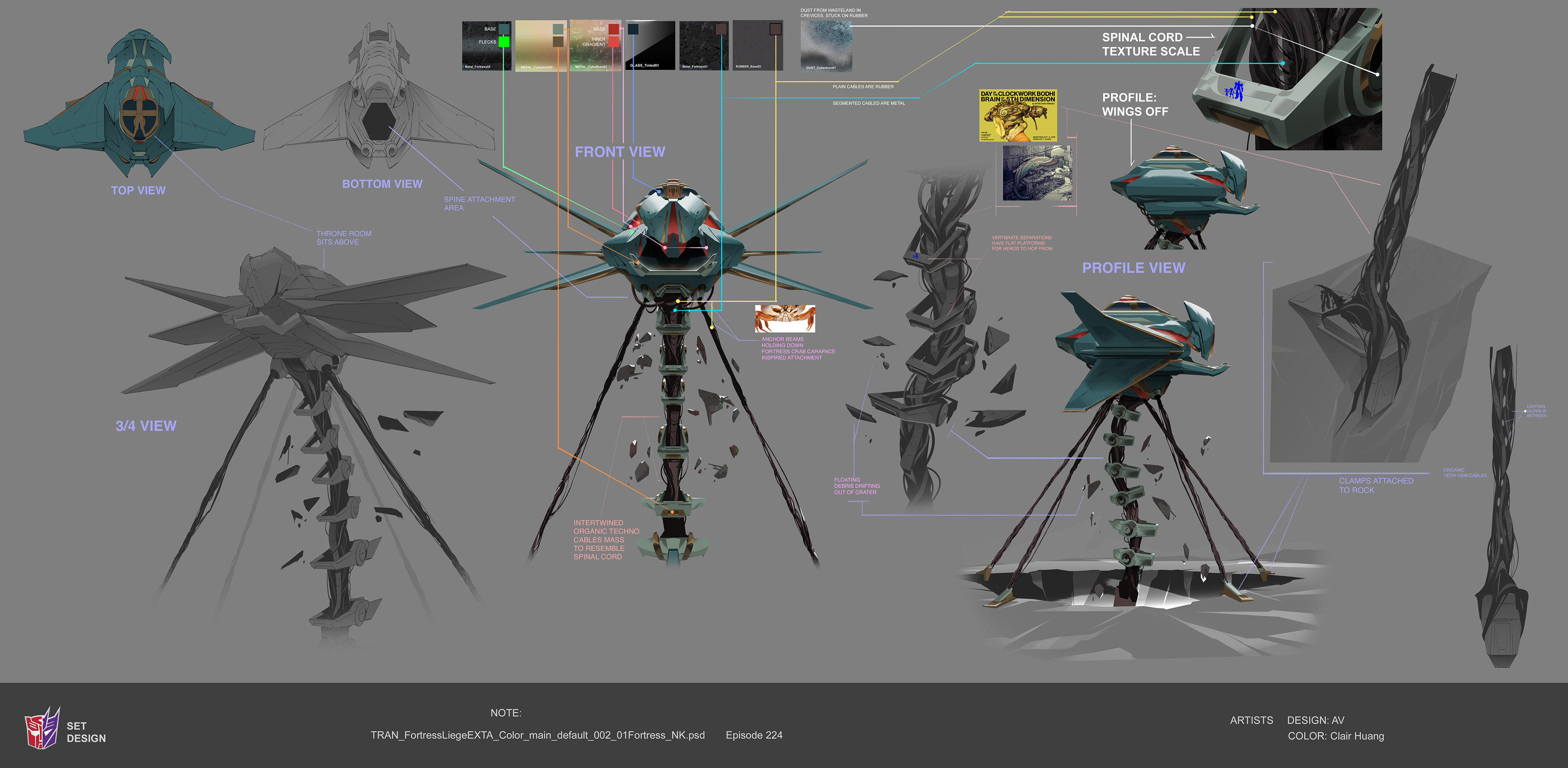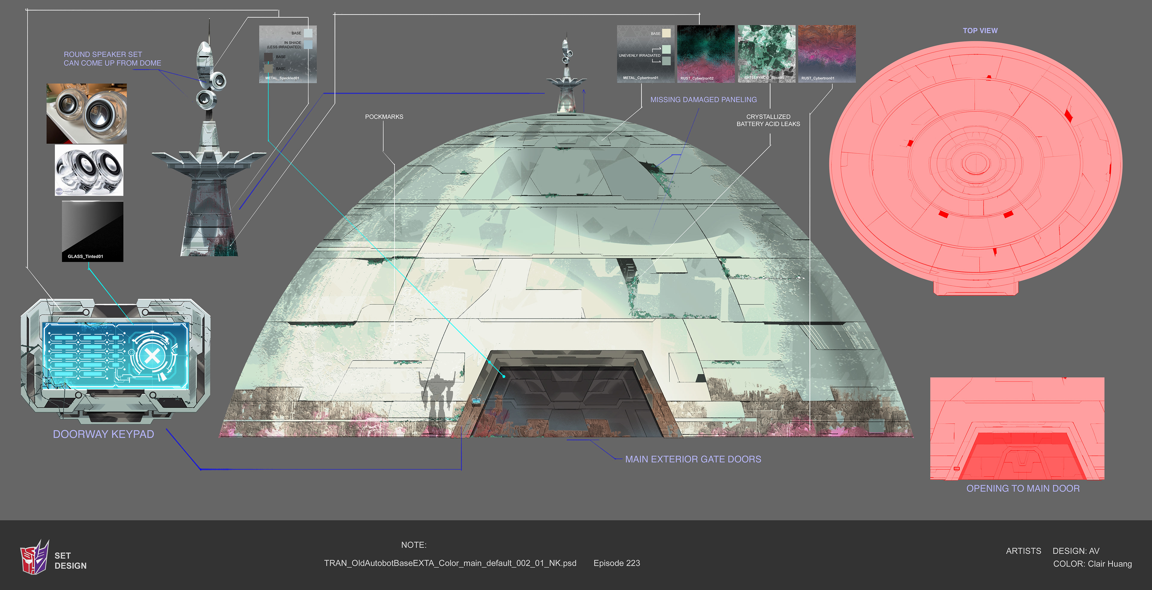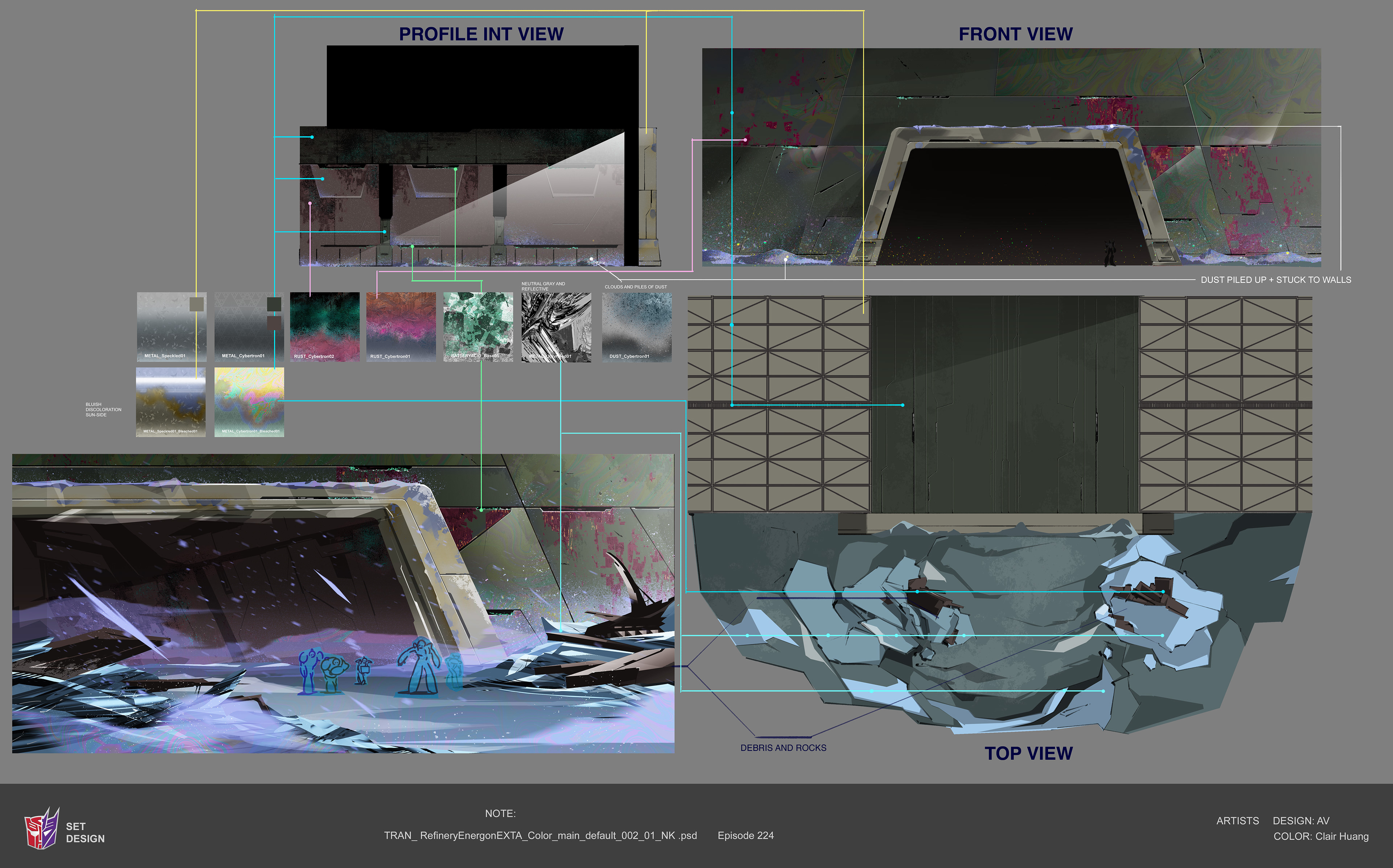 Paintovers of CG team's renders to establish palette and texture structure of ruined Cybertron. Recolored refinery and garage props designed by Angelo Vilar and originally painted by Sophia Nelson. Designed road barriers.